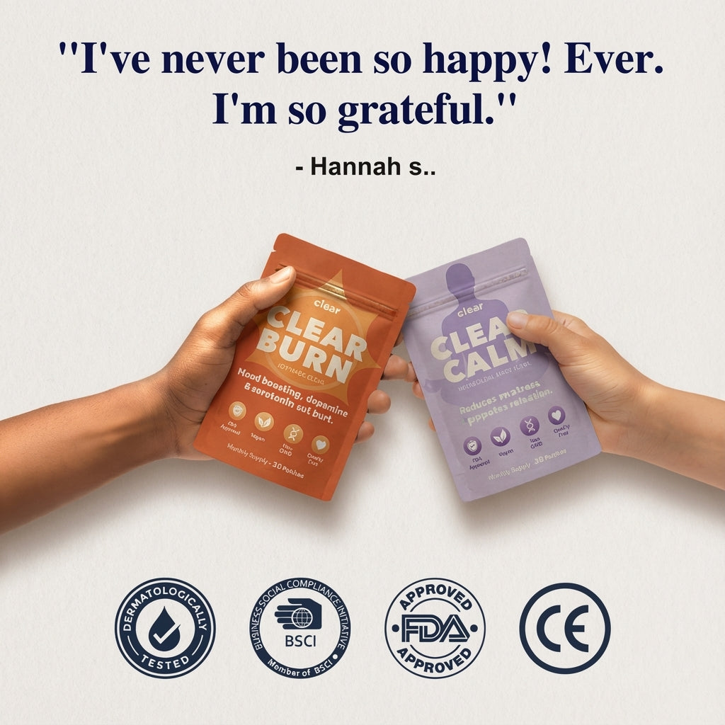 Clear Calm gently supports your nervous system throughout the day, helping your body unwind naturally, reduce restlessness, and settle into a more peaceful state - even during fast-paced or demanding routines.