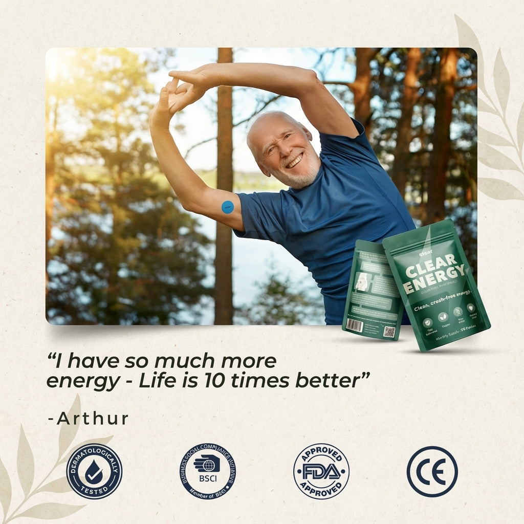 When low motivation, sluggish mornings, or afternoon crashes slow you down, Clear Energy Patches support your body’s natural vitality - boosting steady energy, improving focus, and helping you feel more awake, uplifted, and ready to take on your day.